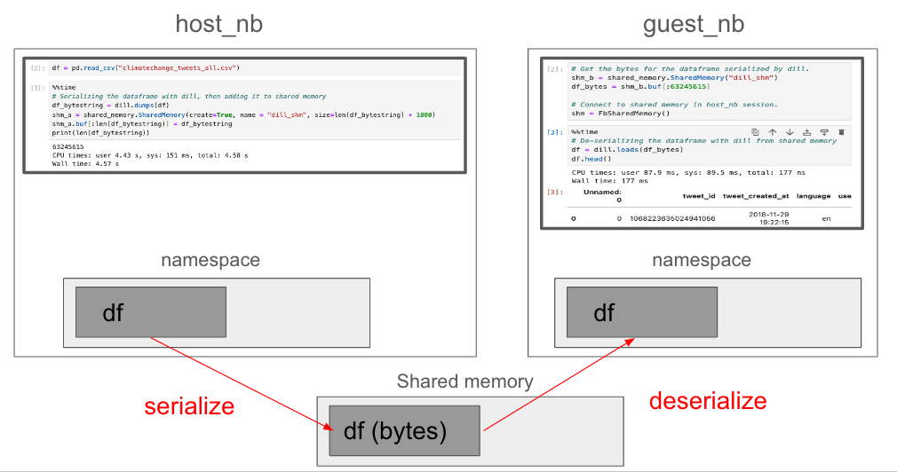 Flatbuffers & Shared Memory: Worked with Google's Flatbuffers and Python's shared memory libraries to pass serialized DataFrames between notebook sessions, and performed various operations directly on the serialized DataFrames.
