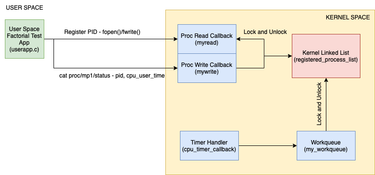 Computing CPU Time: A Linux kernel module for process management using a doubly linked list and proc filesystem, featuring periodic CPU time updates via a workqueue and timer callbacks.