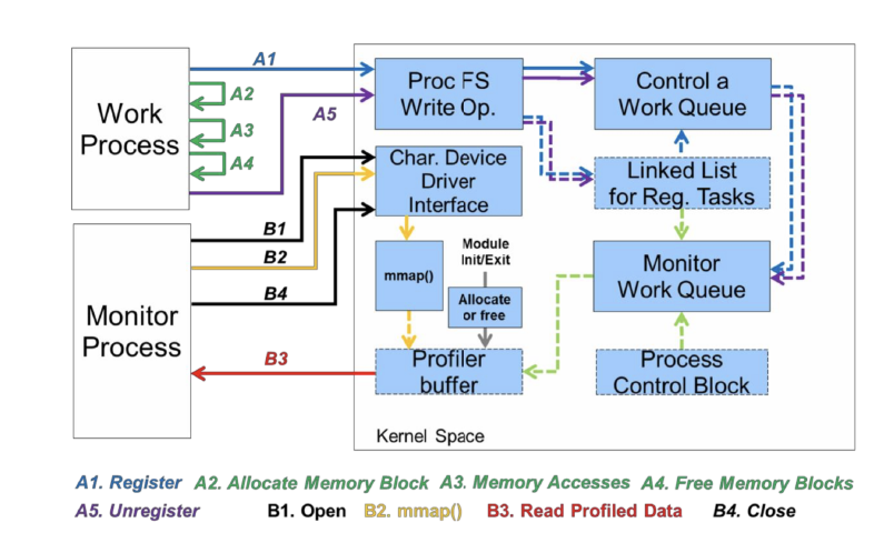 Page Fault Profiler: A kernel-space virtual page fault profiler, monitoring page faults and CPU run times via a virtual memory buffer and delayed work queue at 20 samples per second, and managed process registration through the proc interface.